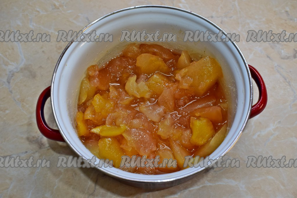 За ночь яблоки пустят сок и заметно уменьшатся в объёме. Поставьте кастрюлю на умеренный огонь и доведите её содержимое, помешивая, до кипения. Проварите 5-7 минут на среднем огне. Выключите огонь, оставьте яблоки настояться и остыть под крышкой. За время медленного остывания яблоки всё равно будут готовиться и становиться мягче. В последствии понадобится меньше времени на варку.