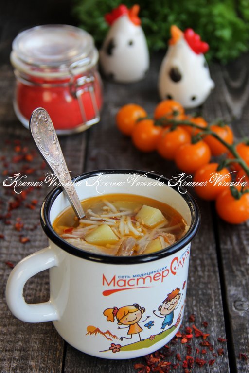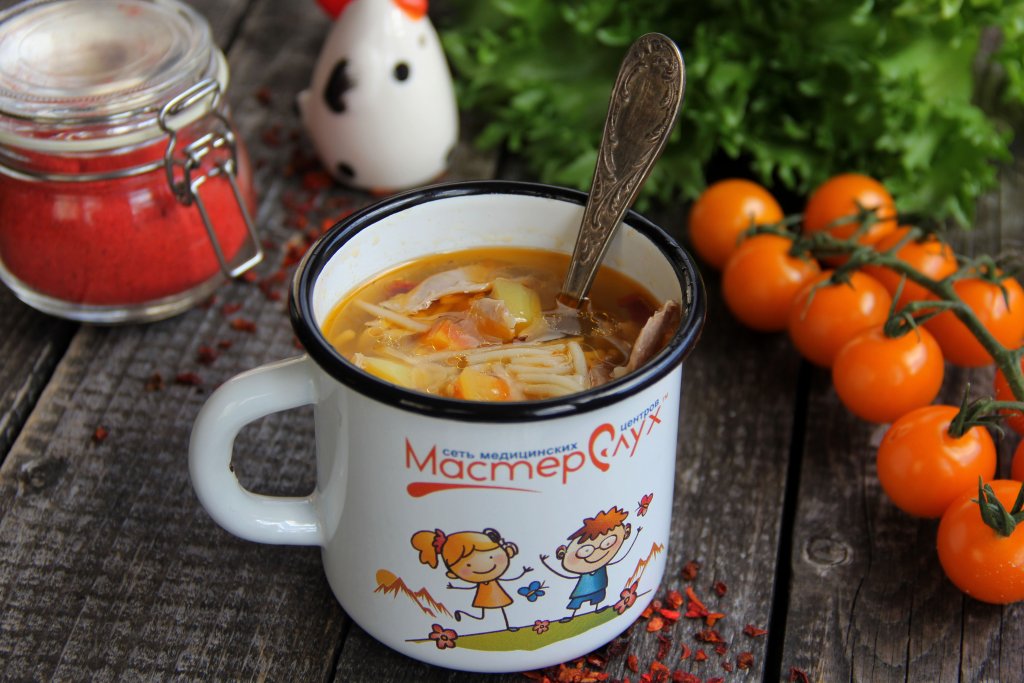 Подать насыщенный, ароматный куриный супчик к столу в горячем виде.