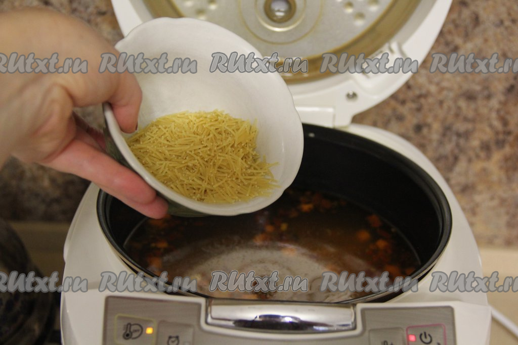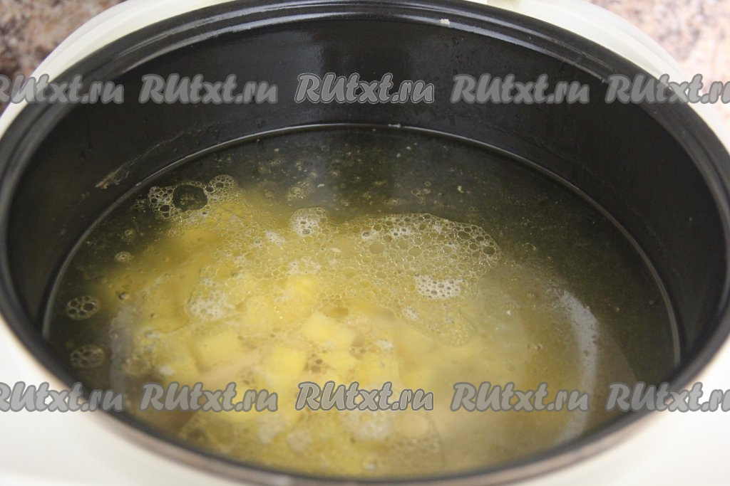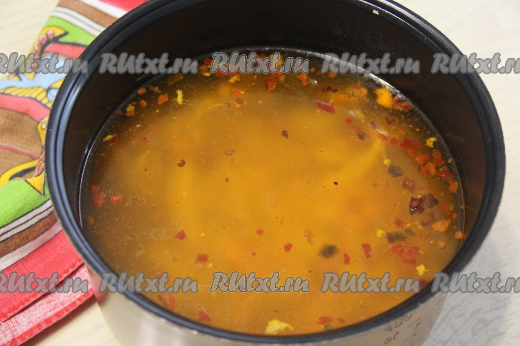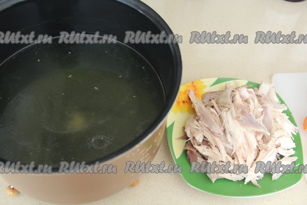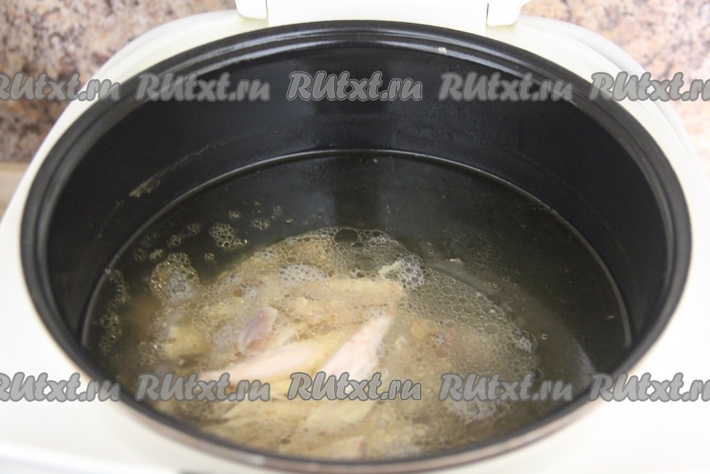 В бульон сразу добавить кусочки мяса. Чашу с бульоном установить в мультиварку.