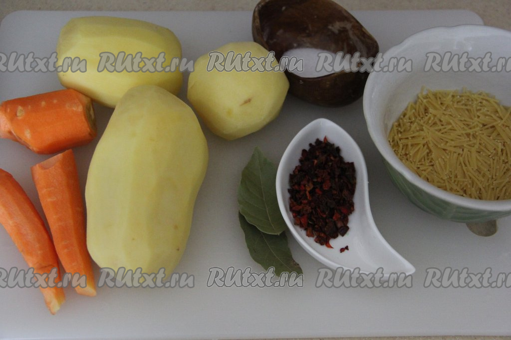 Морковь нарезать на небольшие кубики и положить в чашу вместе с сухими овощами и лавровым листом, крышку закрыть. Включить мультиварку на режиме "Суп" на 30 минут.