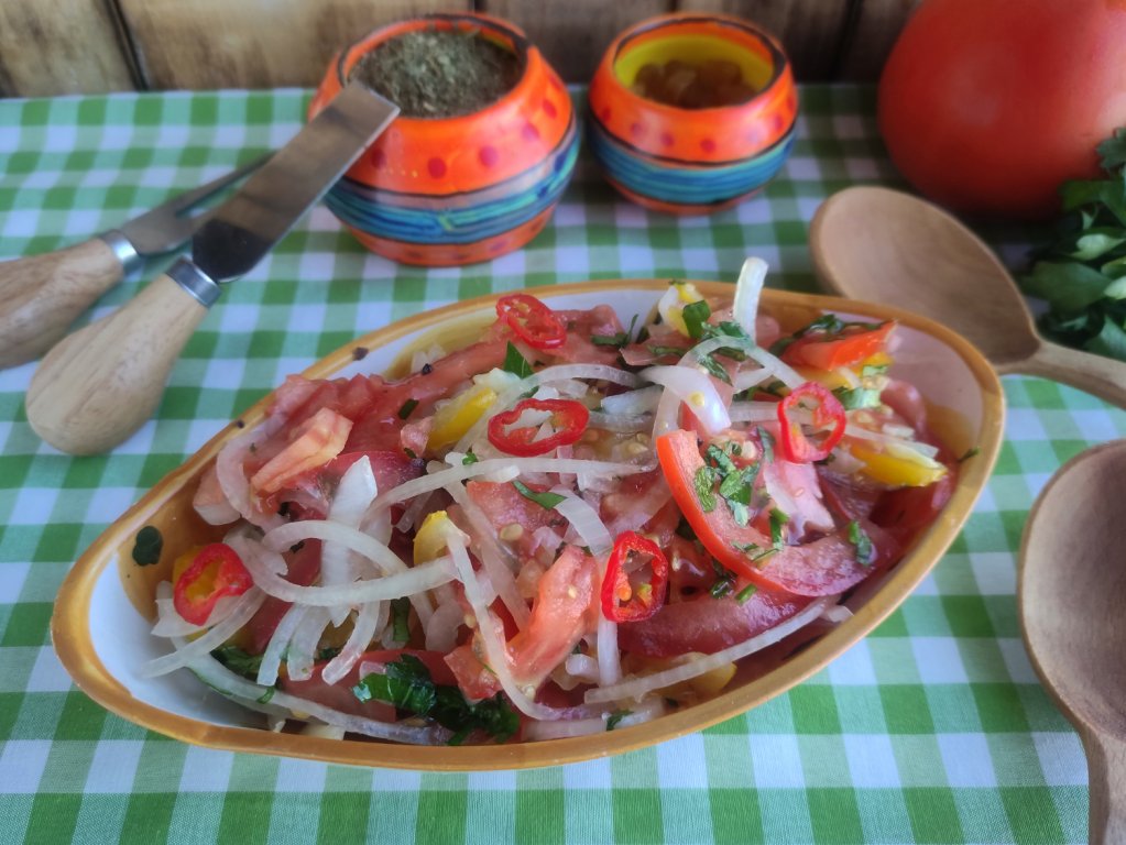 Салат "Шакароб", приготовленный из помидоров, сразу подать к столу. В Азии этот салат принято подавать к плову, который раскладывается по тарелкам, а сверху выкладывается щедрая порция салата. Вкусно, сочно, ароматно, попробуйте!
