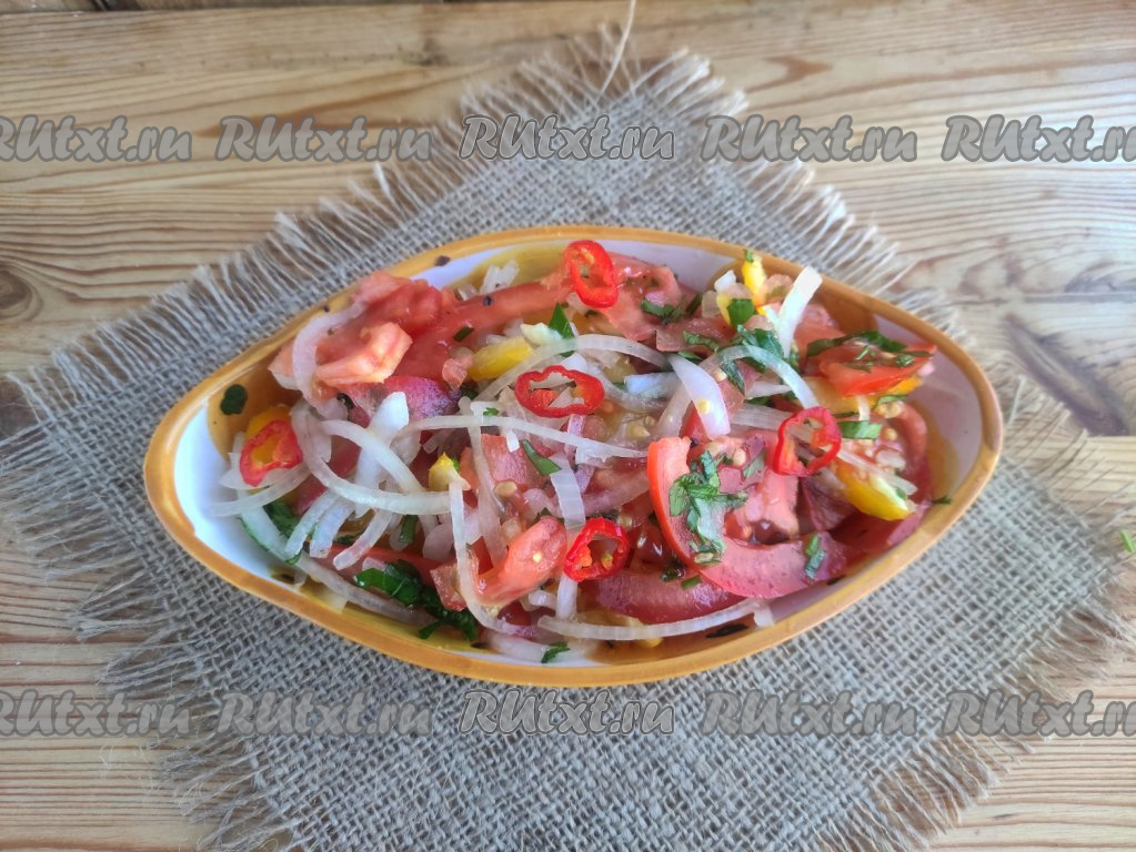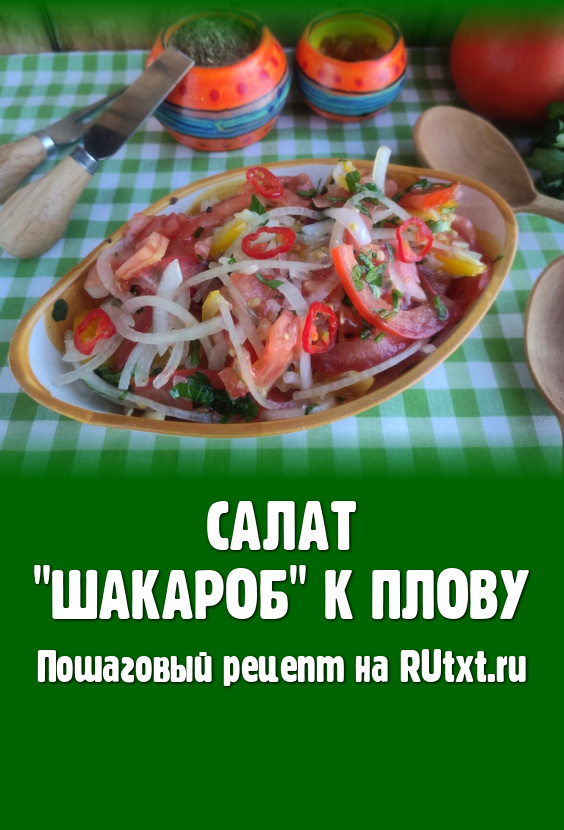 Салат "Шакароб" - визитная гастрономическая карточка ферганской долины. Без этого блюда невозможно представить себе подачу азиатского плова. Рецепт очень простой. Салат "Шакароб" из помидоров готовят на один раз и сразу подают к столу, его не хранят в холодильнике. Для этого блюда потребуются мясистые, сочные помидоры южных сортов. Великолепный вкус этого салата понравится всем, кто его попробует!