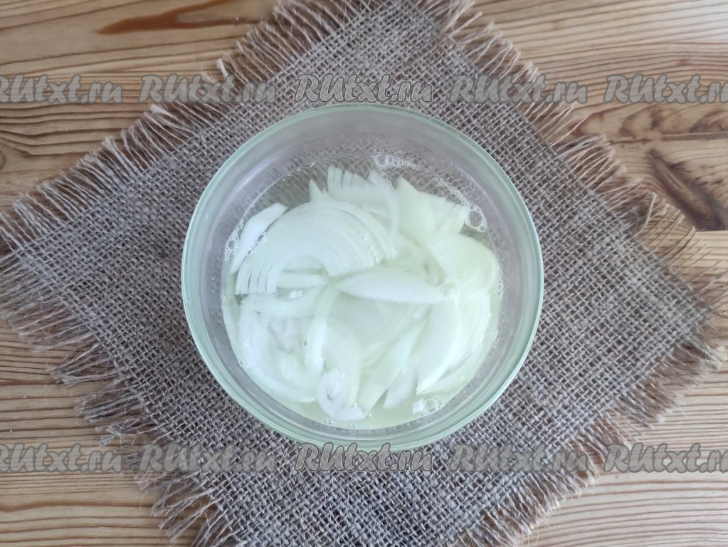 Выложить луковые полукольца в миску, влить кипяток, оставить на 30 секунд.