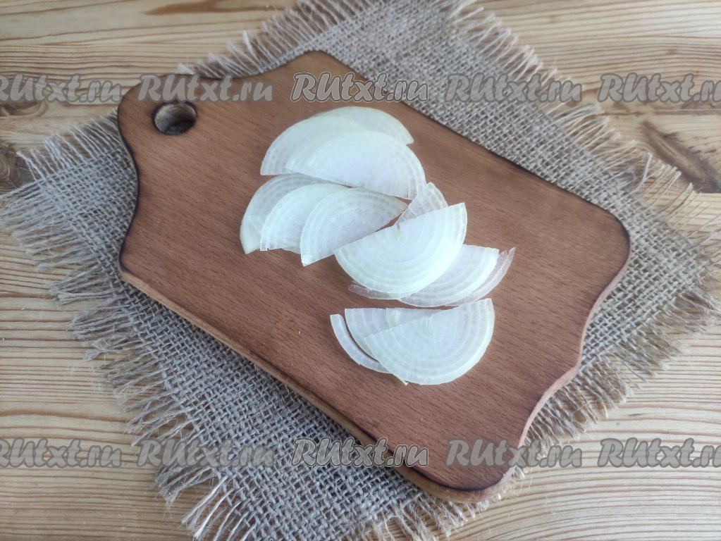 Очищенный лук нарезать тонкими полукольцами.