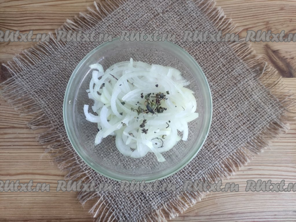 Затем промыть ошпаренный лук холодной водой. Добавить к луку сухой базилик, перемешать.
