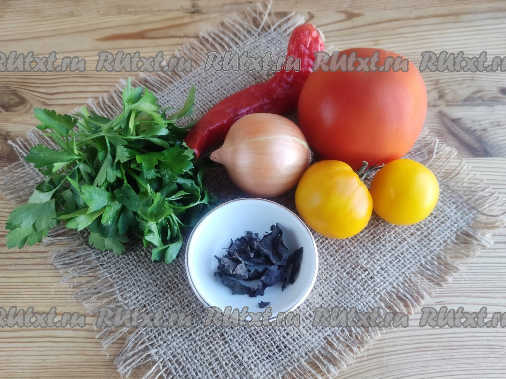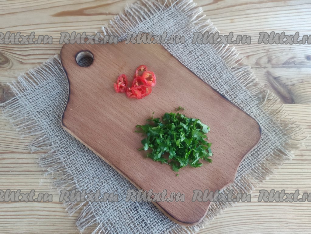 Листья петрушки мелко нарезать. Горький перец нарезать на тонкие колечки и вместе с петрушкой выложить в салат.