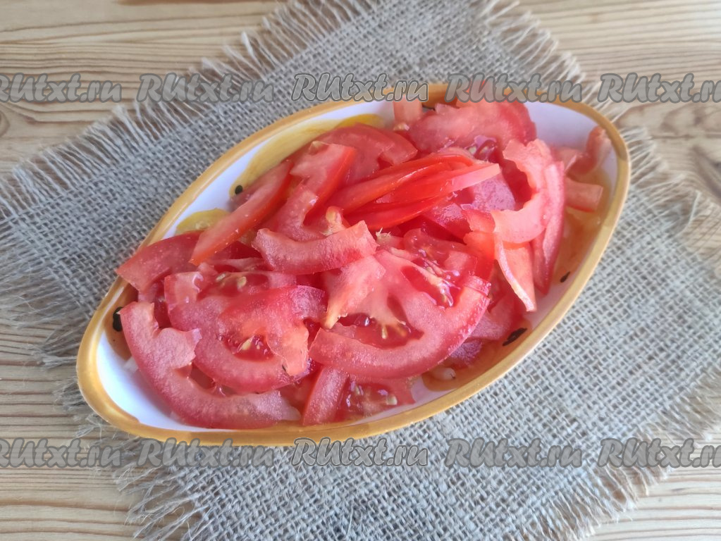 Аналогично нарезать красный помидор.
