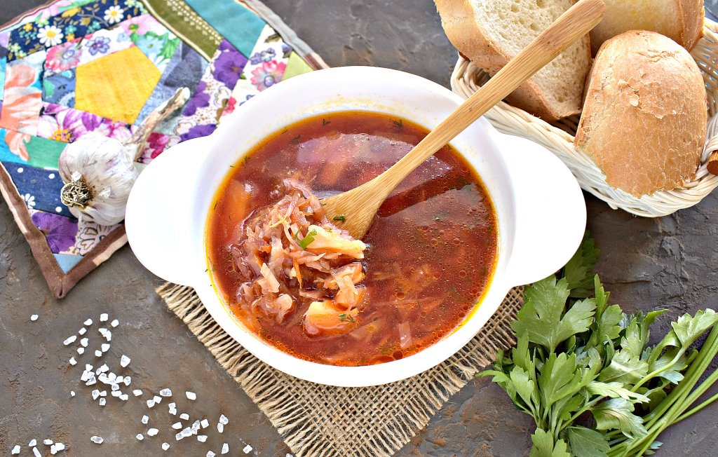Предлагаю сварить борщ из кусочков курицы со свежей капустой и свеклой. Такое первое блюдо получается очень вкусным и наваристым, оно прекрасно впишется в повседневное меню. У борща яркий характерный цвет, к столу его можно предложить со сметаной и пампушками.
