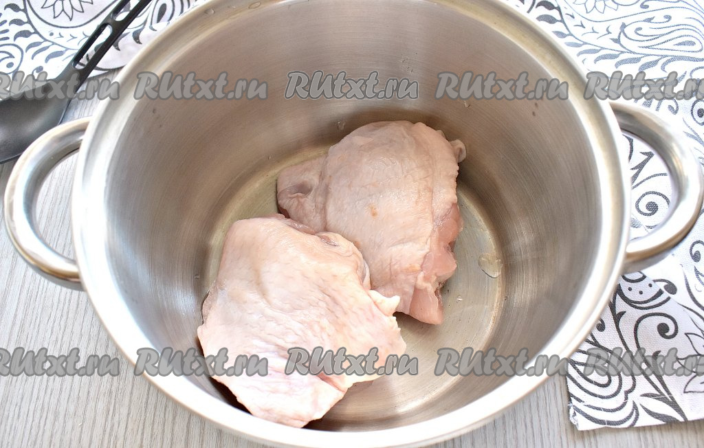 Для варки бульона я взяла куриные бёдра, но можно сварить бульон из любых частей курицы на ваш вкус. Вымытые кусочки курицы кладём в кастрюлю, вливаем 2 литра воды и ставим вариться на плиту.