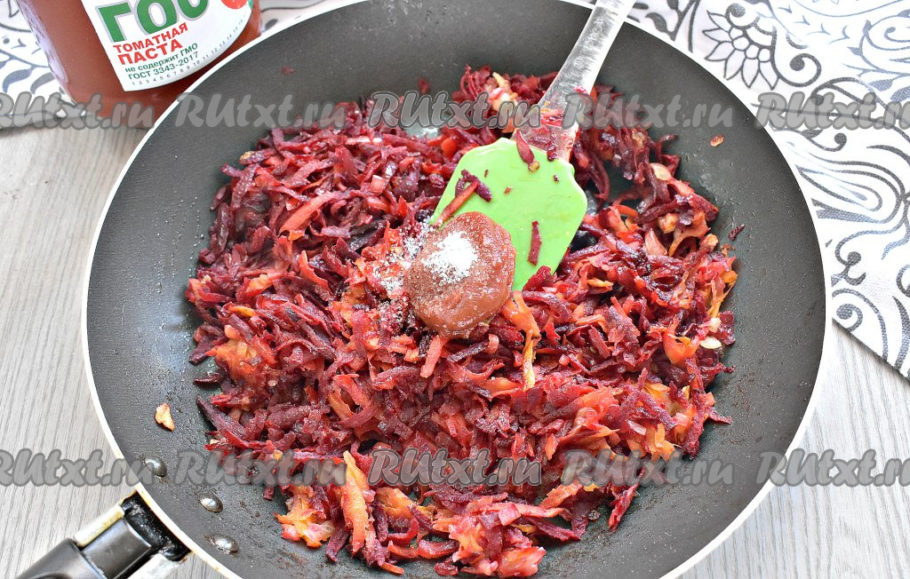 На сковороду к обжаренным овощам выкладываем томатную пасту. Если паста слишком кислая, то посыпьте её сахаром. Перемешиваем.