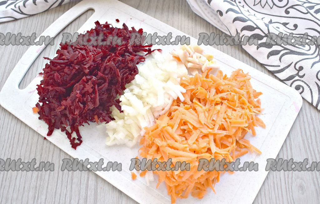 Очищенные морковку и свеклу натираем на тёрке. Луковицу и чеснок нарезаем достаточно мелко.