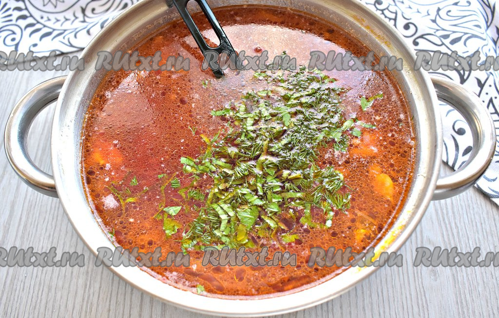 Затем добавляем измельчённую зелень, даём закипеть, снимаем с огня, сразу накрываем кастрюлю крышкой и даём борщу настояться 10 минут.