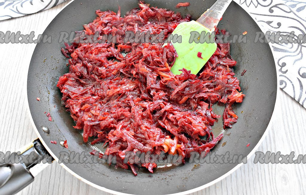 В сковороде прогреваем растительное масло. Сначала 2-3 минуты обжариваем в масле на среднем огне лук и чеснок, помешивая, затем добавляем натёртые морковку и свеклу. Обжариваем овощи 6-7 минут, иногда перемешивая.