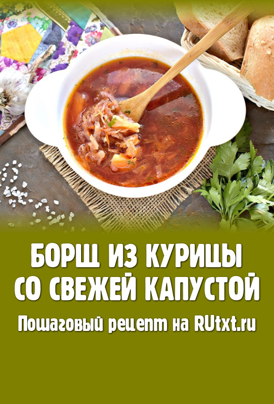 Яркий, вкусный, наваристый борщ, сваренный из курицы со свежей капустой, разливаем по тарелкам и подаём к столу. Сдабриваем, по желанию, сметаной или майонезом.