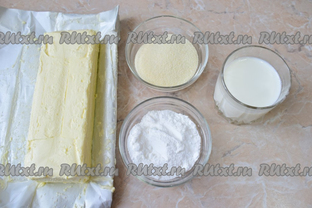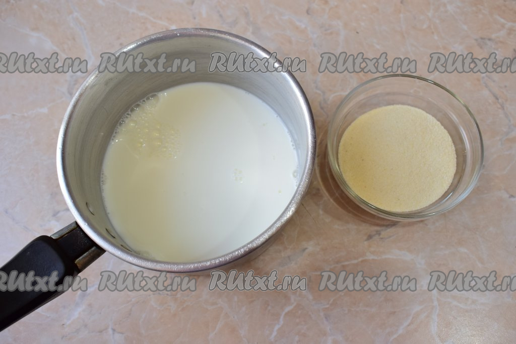 Для приготовления крема понадобится совсем немного ингредиентов - манка, молоко, сливочное масло и сахар. Сливочное масло должно быть мягким, поэтому заранее достаньте его из холодильника.