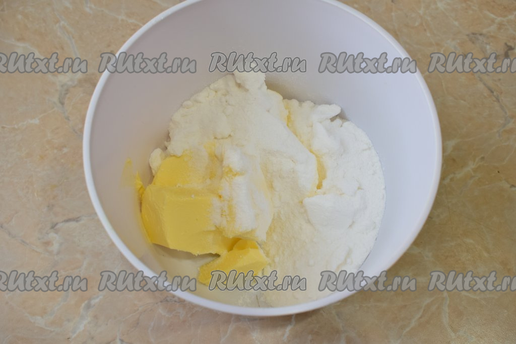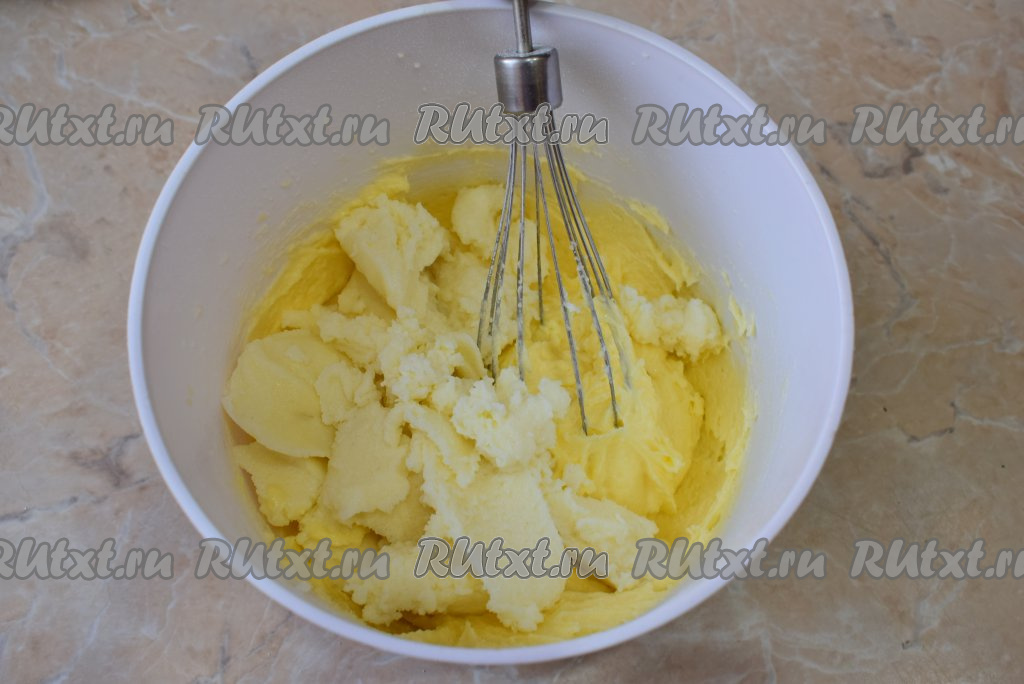 Когда манная каша остынет до комнатной температуры, займёмся дальнейшим приготовлением крема. В чашу для взбивания выложите мягкое сливочное масло, добавьте к нему сахарную пудру и щепотку ванилина. Не рекомендую заменять пудру на сахар. Он не успеет раствориться в креме и в последствии будет хрустеть на зубах. А это не очень приятно ощущать в торте. Сначала перемешайте пудру с маслом с помощью миксера, а затем взбейте, чтобы масло стало более пышным.