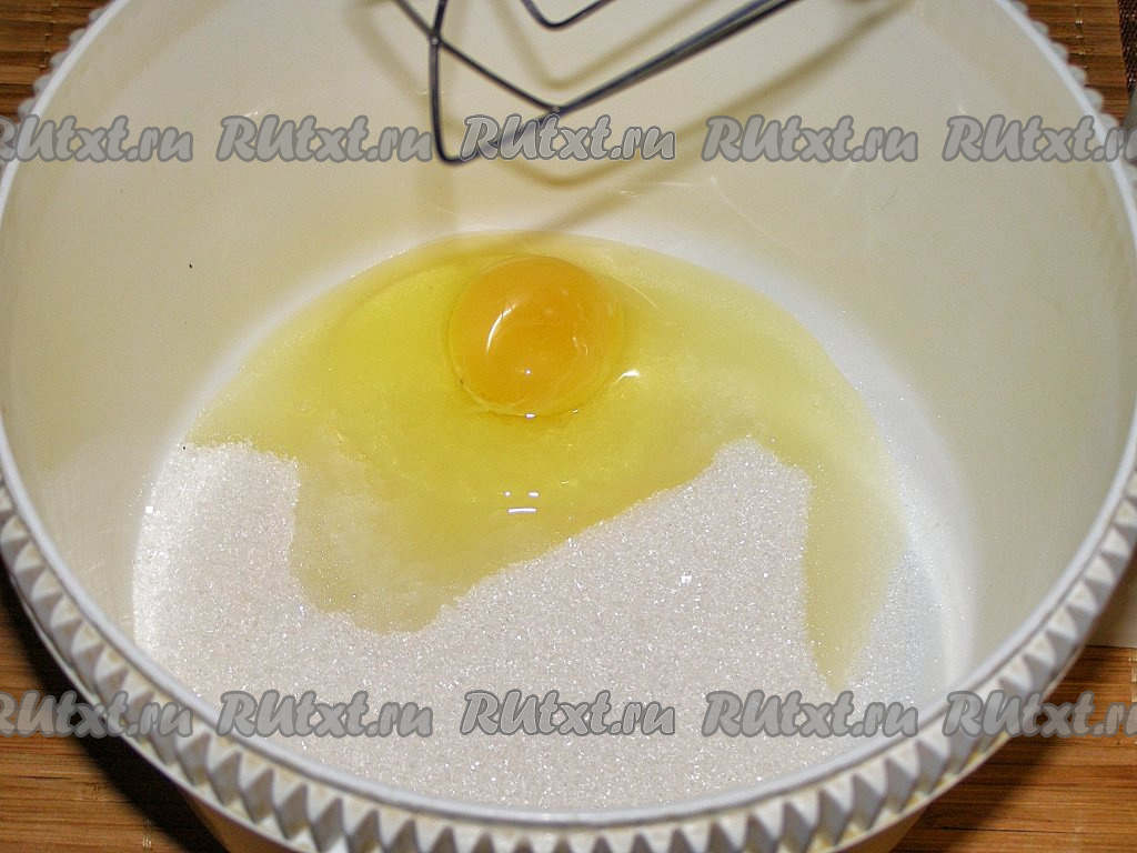 В достаточно объёмную миску (или в чашу для взбивания) насыпаем сахар, добавляем яйцо, с помощью венчика (или миксером) смешиваем практически до однородного состояния.