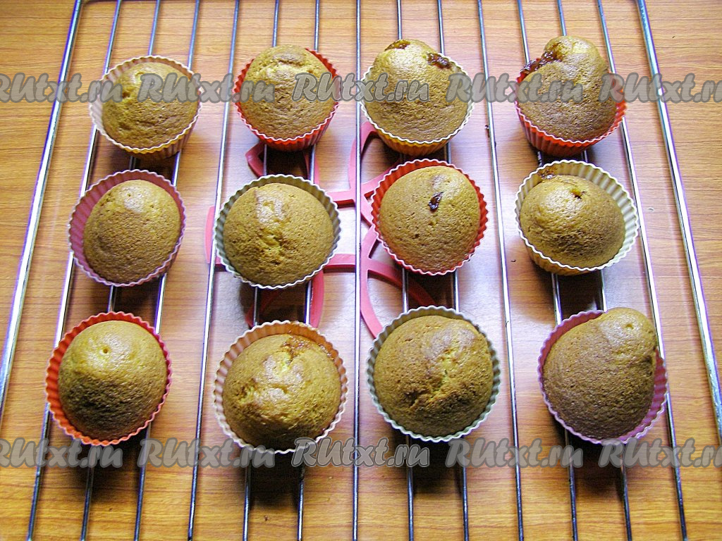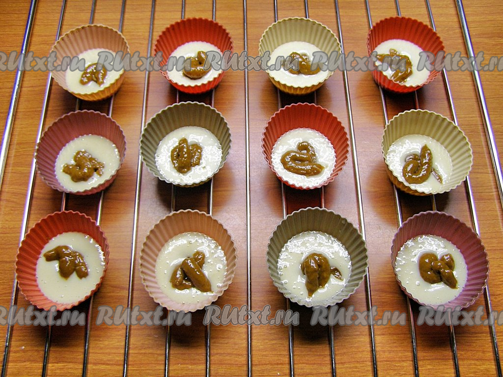 Сверху на начинку выкладываем по 1-1,5 столовых ложки оставшегося теста. Кексы хорошо поднимутся в процессе выпечки, поэтому не нужно заполнять формочки больше, чем на 2/3 объёма.