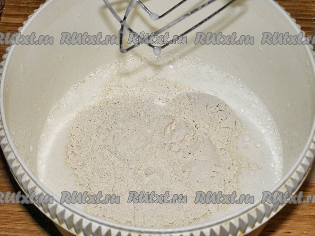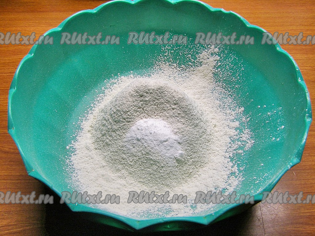 В отдельную миску просеиваем муку, добавляем в неё разрыхлитель теста.