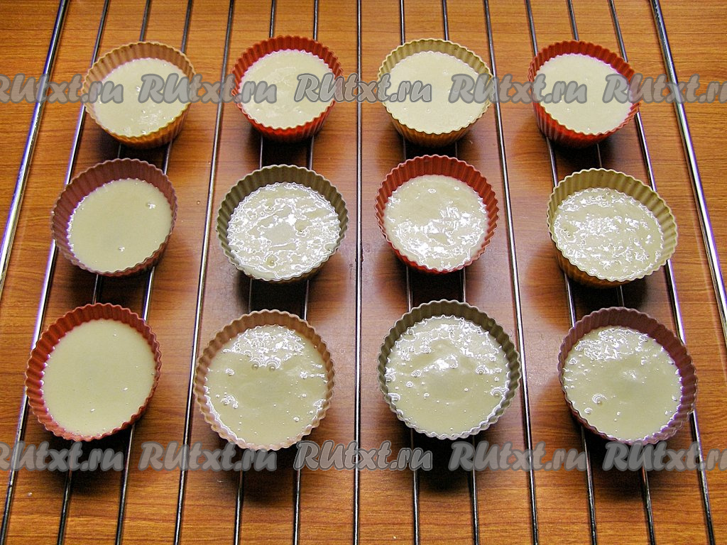 В силиконовые формочки (у меня 12 небольших силиконовых формочек) вливаем по 1,5 столовых ложки теста.