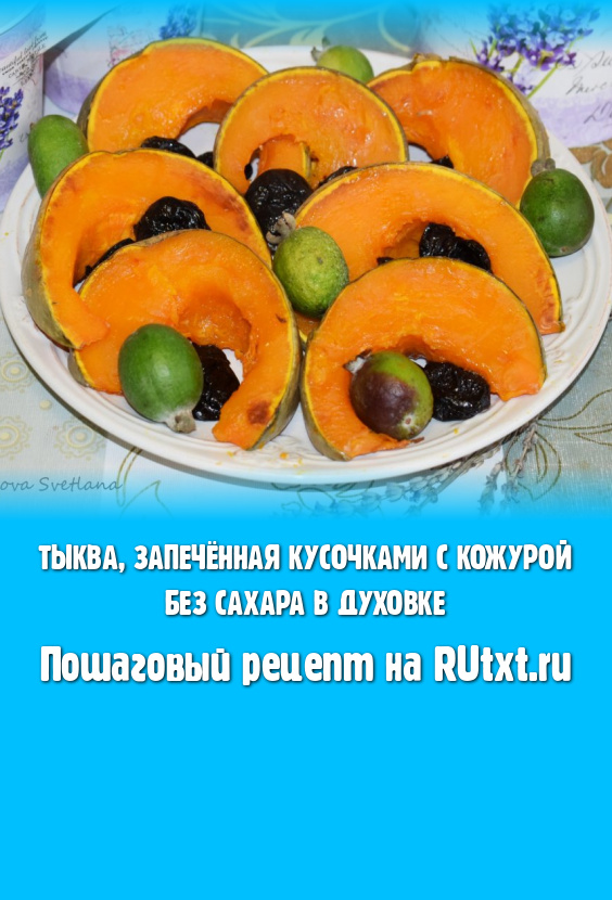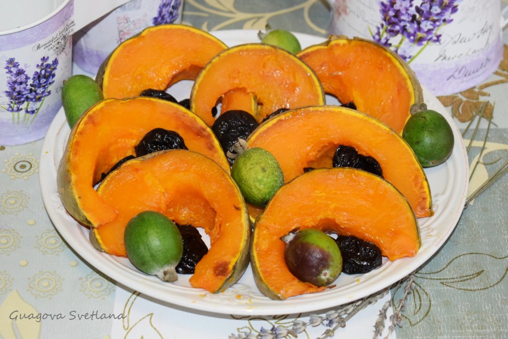 Кусочки тыквы, запечённые без сахара в духовке, подаём с сухофруктами (например, с черносливом, курагой) или со свежими фруктами (например, с фейхоа, хурмой, сладкими яблоками). Полезный и вкусный десерт из тыквы готов, кушайте с удовольствием!