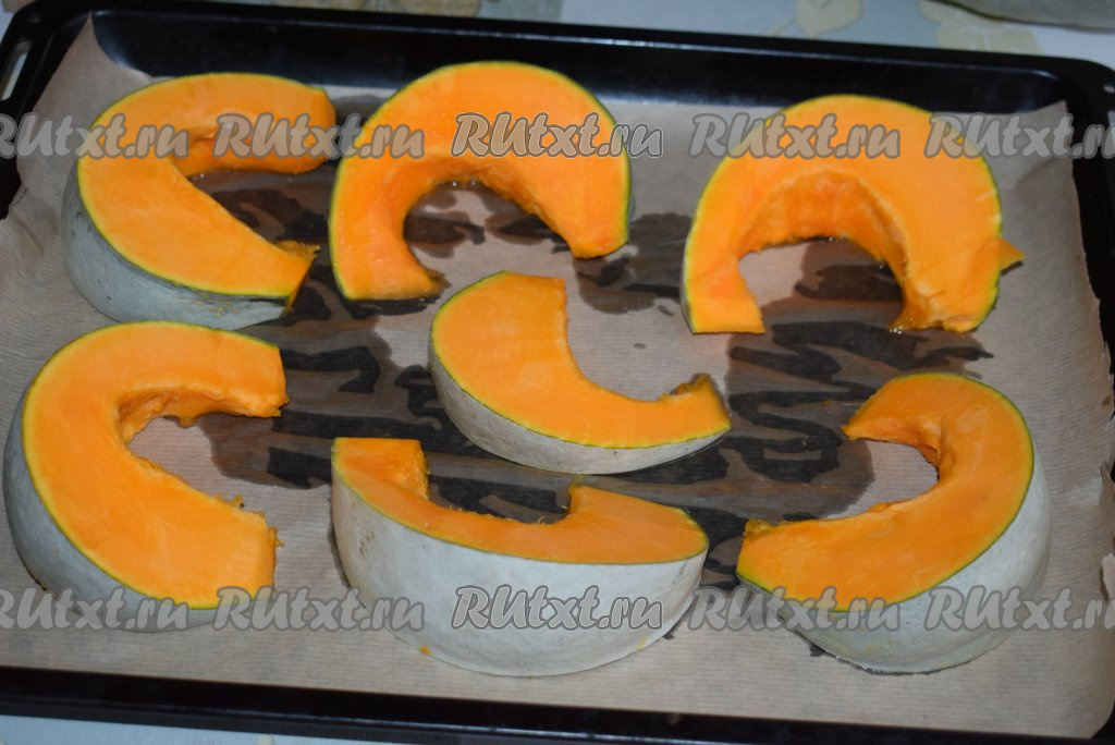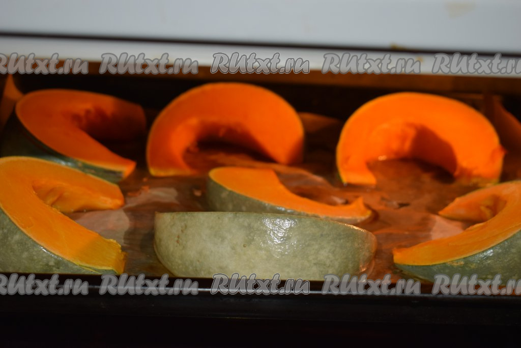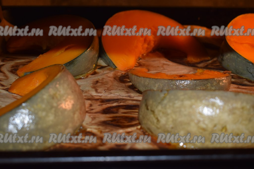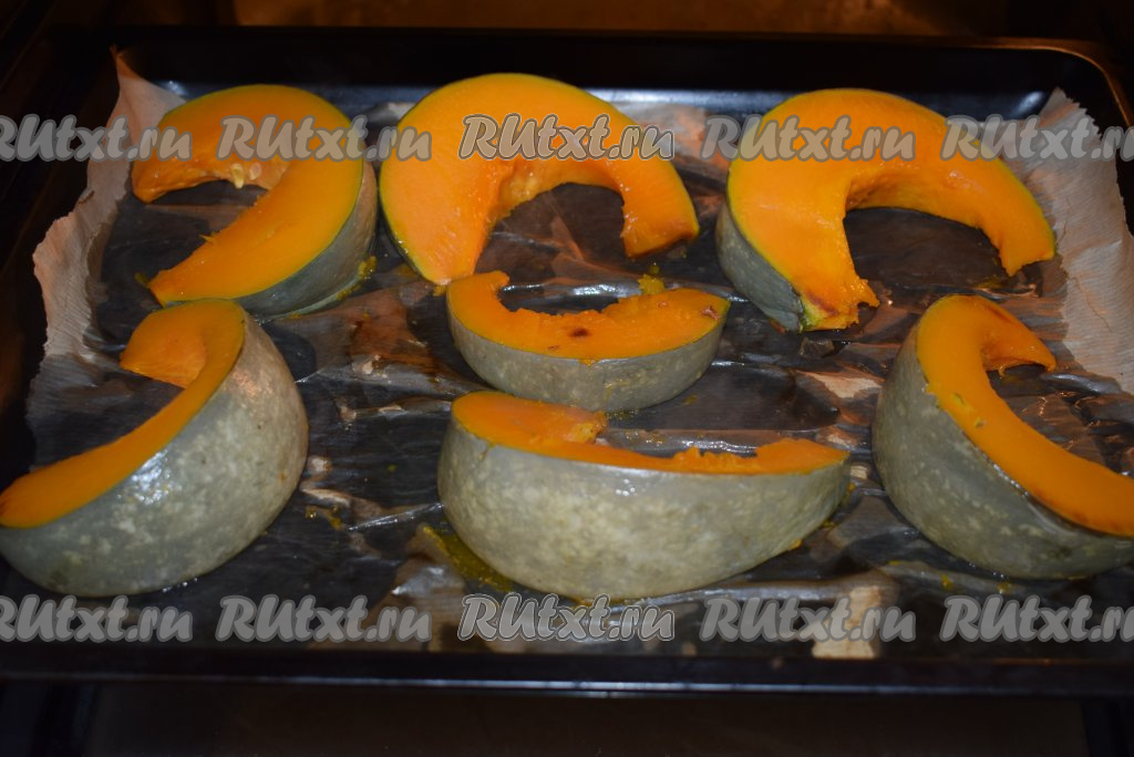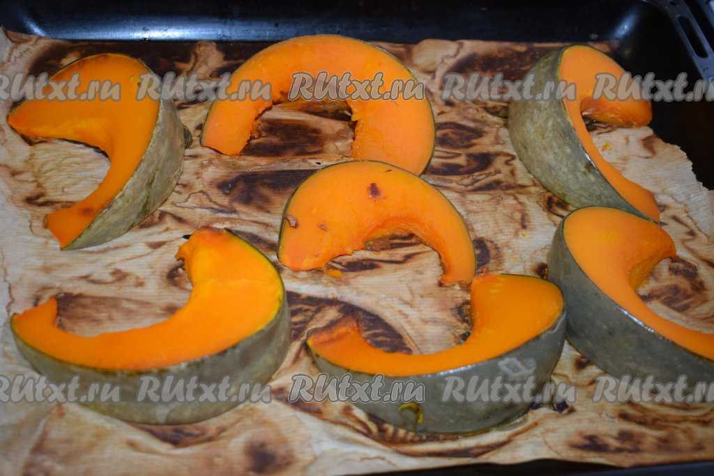 Отправляем противень с кусочками тыквы в разогретую духовку и запекаем при температуре 200 градусов, примерно, 30 минут.
