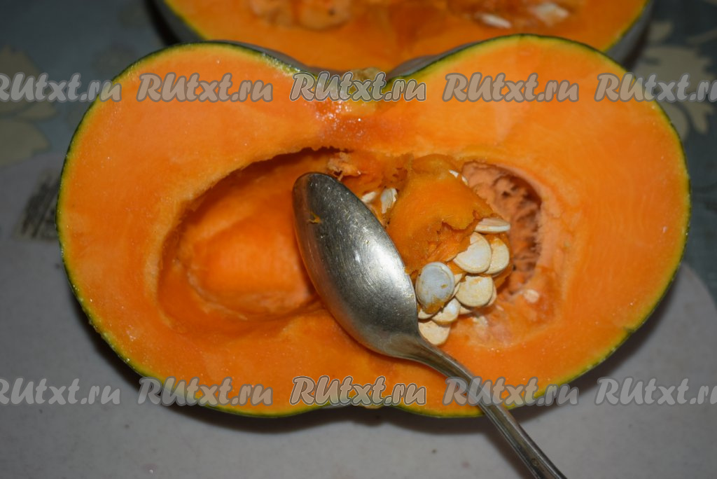 Столовой ложкой очищаем тыкву внутри от семян и волокнистой части.