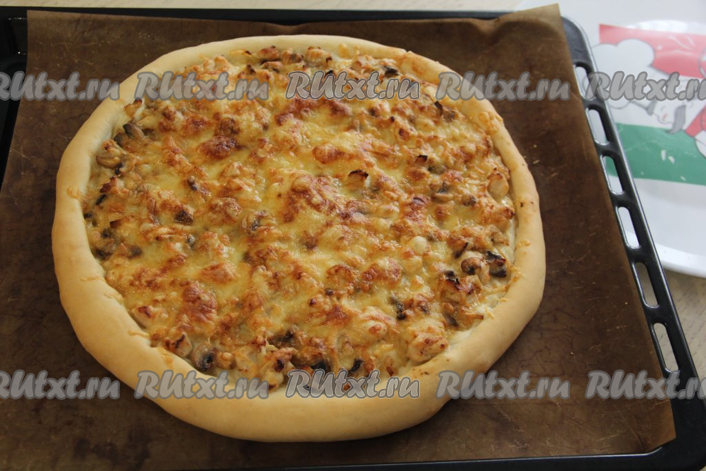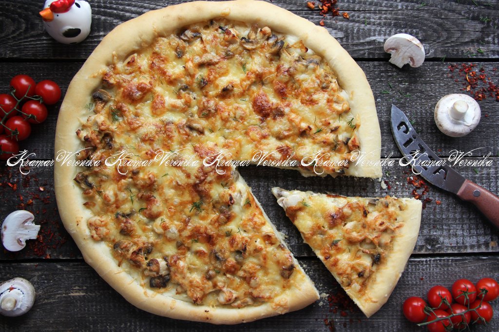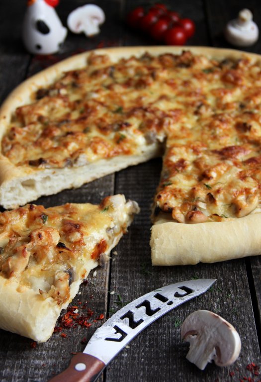 Предлагаю испечь дома вкусную и сытную пиццу "Жульен" с курицей и грибами. В качестве начинки для такой пиццы используется куриное мясо без костей, грибы и сливки. Для этой выпечки идеально подходит куриное филе, а из грибов - вешенки или шампиньоны. Сливки можно брать любой жирности, я использовала сливки жирностью 10%. Начинка получилась очень вкусной и сочной. Пышный край основы хорошо сохраняет начинку и не даёт ей вытекать.