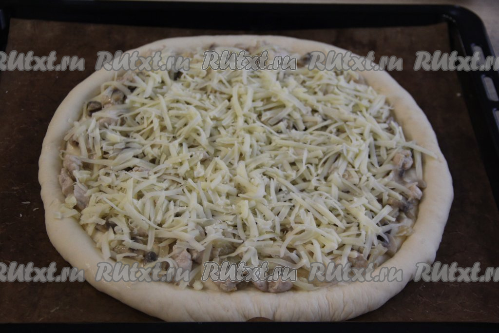 Сыр натереть на тёрке и посыпать им сверху пиццу.