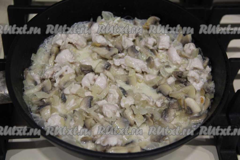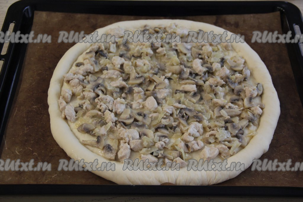 Обжаривать куриное мясо с грибами минут 15, посолить по вкусу. Периодически перемешивайте, чтобы содержимое сковороды не пригорело. Затем влить сливки и потомить пару минут. Снять с огня начинку для пиццы и дать остыть.