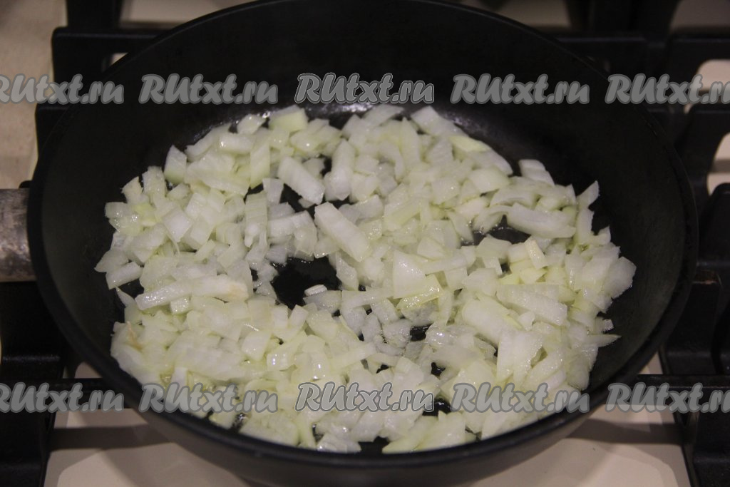 Лук почистить, достаточно мелко нарезать. В сковороду влить немного растительного масла, выложить лук и обжарить его до золотистого цвета на среднем огне, иногда помешивая.