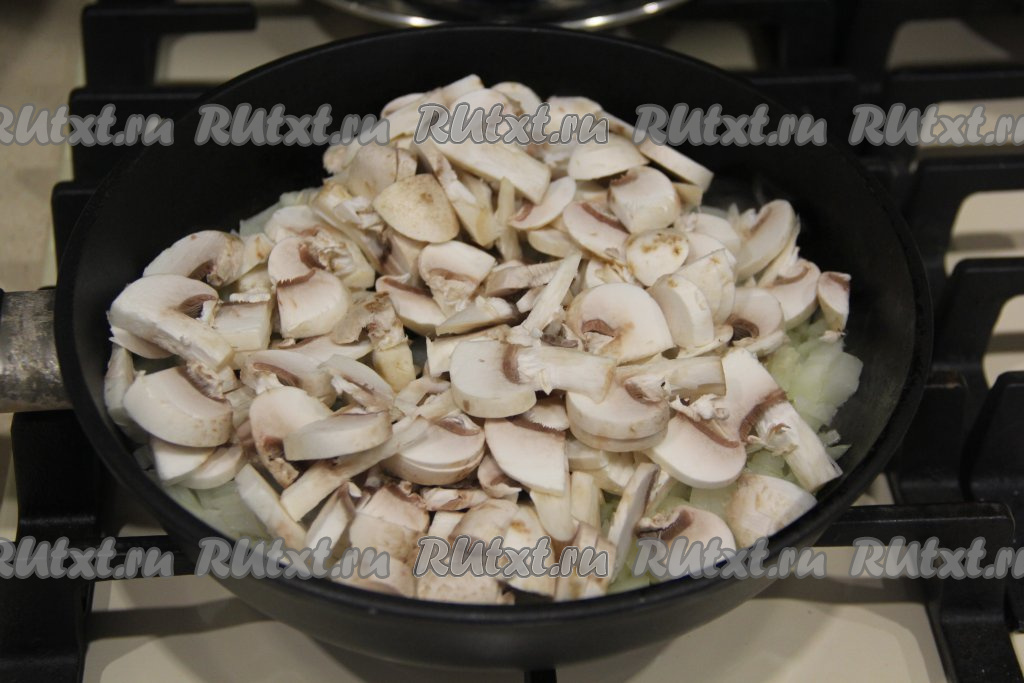 Шампиньоны промыть под водой и нарезать на пластинки. Выложить нарезанные грибы в сковороду к луку, хорошо перемешать.