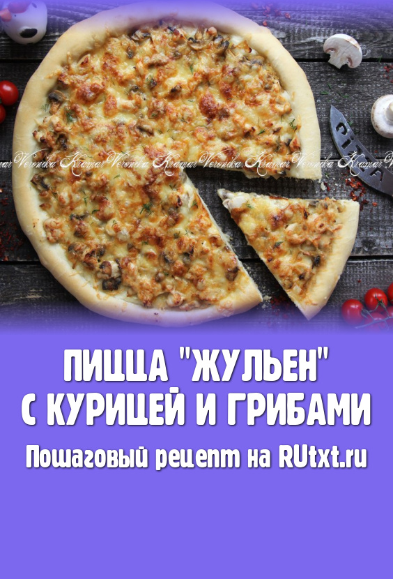 Пиццу "Жульен" с курицей и грибами подать к столу в горячем виде. Такая пицца с сочной и сытной начинкой накормит всю семью!