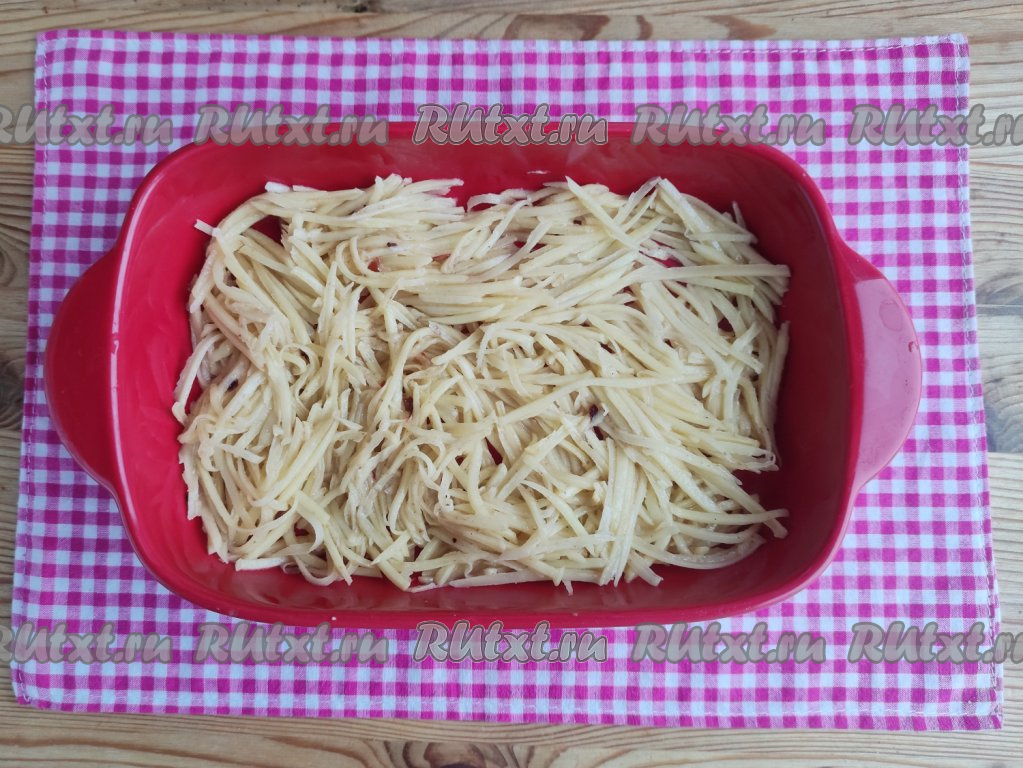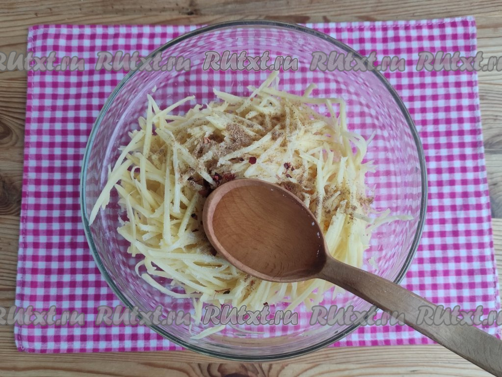 Очищенный картофель натереть на тёрке для корейской моркови (можно натереть и на обычной крупной тёрке).
