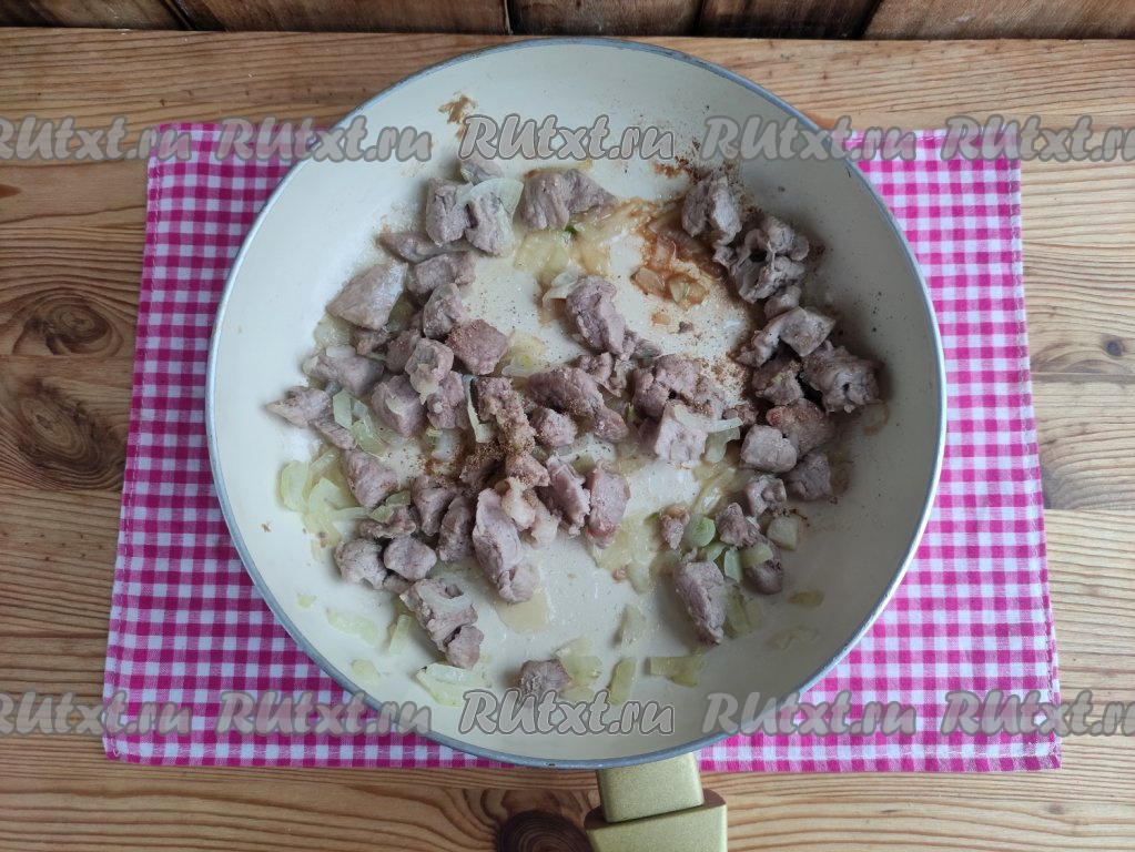 2 столовые ложки растительного масла влить в сковороду, разогреть, затем выложить свинину с луком и обжарить на среднем огне, помешивая, в течение 4-5 минут, посолить, сдобрить специями, убрать с огня и дать немного остыть.