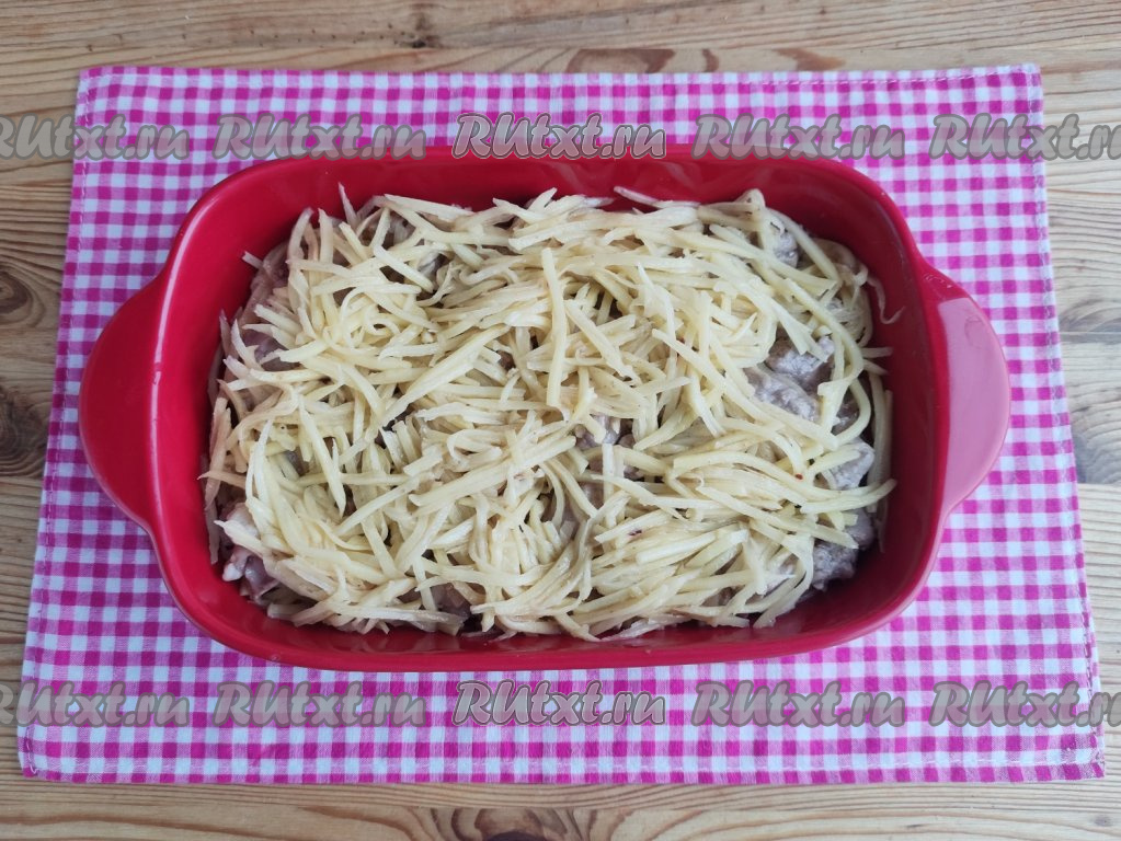 Поверх свинины выложить оставшуюся картошку. Влить в форму 1-2 столовых ложки воды. Готовить запеканку в разогретой духовке 20 минут при температуре 190 градусов. Затем достать картофельную запеканку из духовки и посыпать блюдо натёртым на крупной тёрке сыром. Отправить форму обратно в духовку на 20-25 минут.