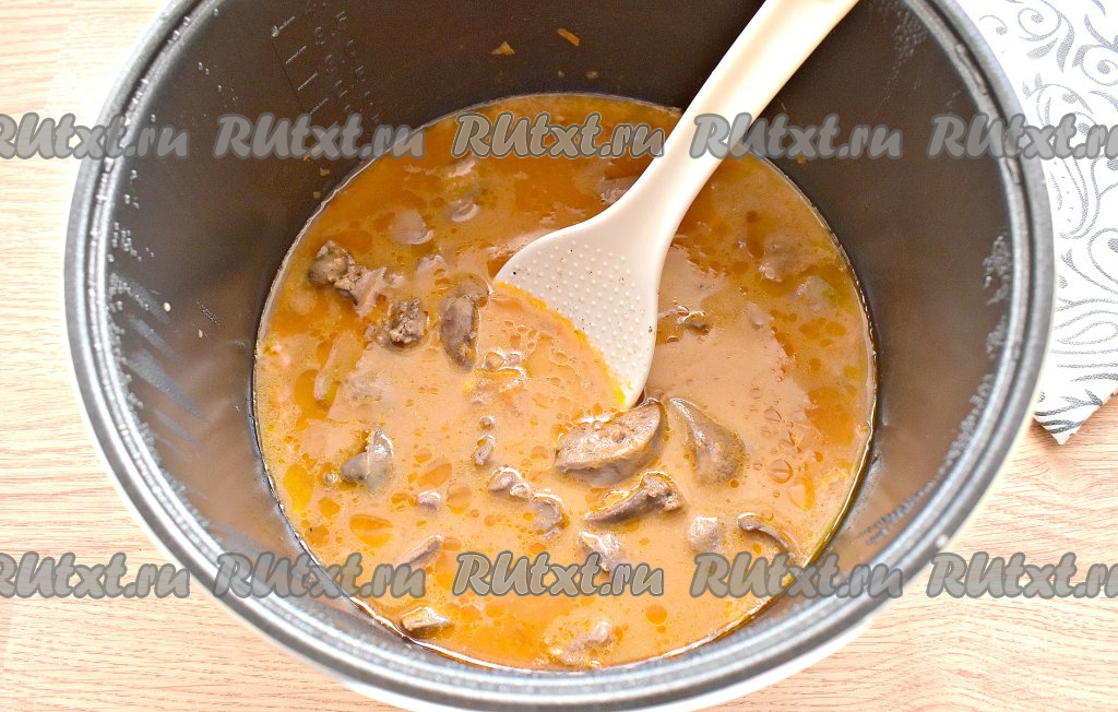 После того как кусочки куриной печени поменяют цвет, вливаем подливку в чашу мультиварки. Печёнку с овощами по вкусу солим, перчим, добавляем паприку, перемешиваем.