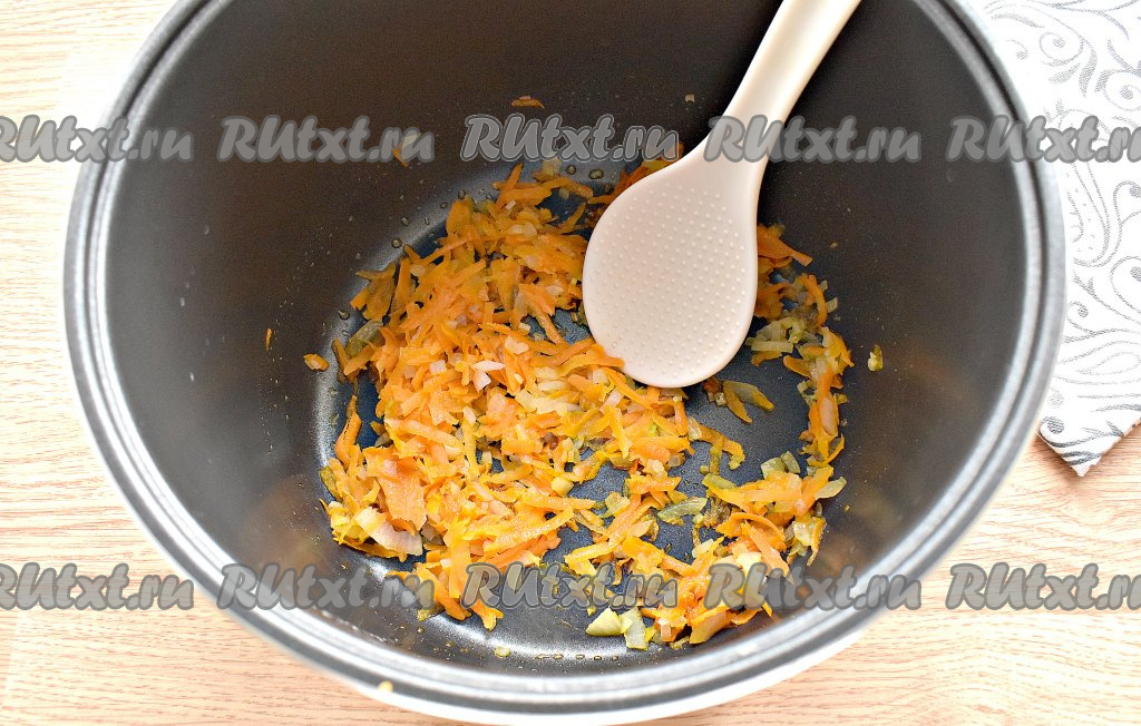 Включаем программу мультиварки "Жарка", в чашу вливаем растительное масло, выкладываем морковку с луком и обжариваем овощи, не накрывая крышкой, иногда перемешивая, в течение 5 минут.