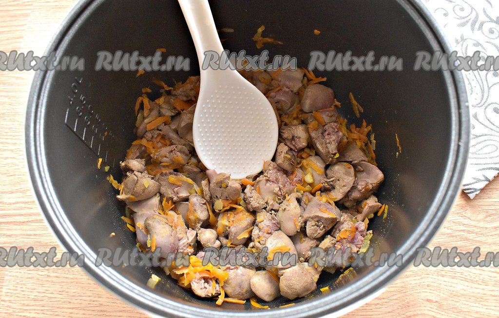 Куриную печень промываем, если на печёнке есть белые прожилки, срезаем их. Крупные куски печени разрезаем на части поменьше. Выкладываем подготовленную печень к обжаренным овощам.