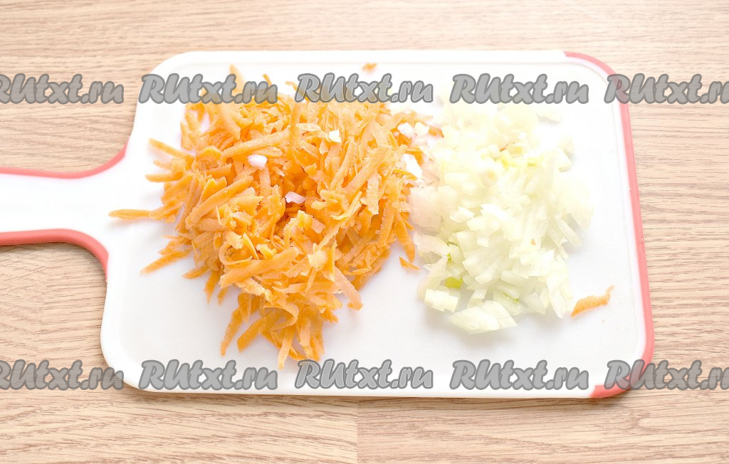 Очищаем морковку и лук. Натираем морковь на тёрке, лук нарезаем на небольшие кусочки.