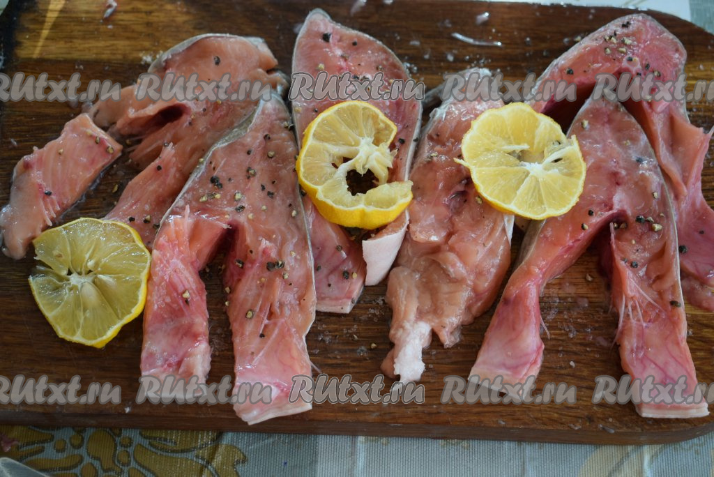 Далее посыпаем кусочки горбуши душистым молотым перцем и слегка сбрызгиваем лимонным соком. Оставляем рыбу просолиться на 10-12 минут.