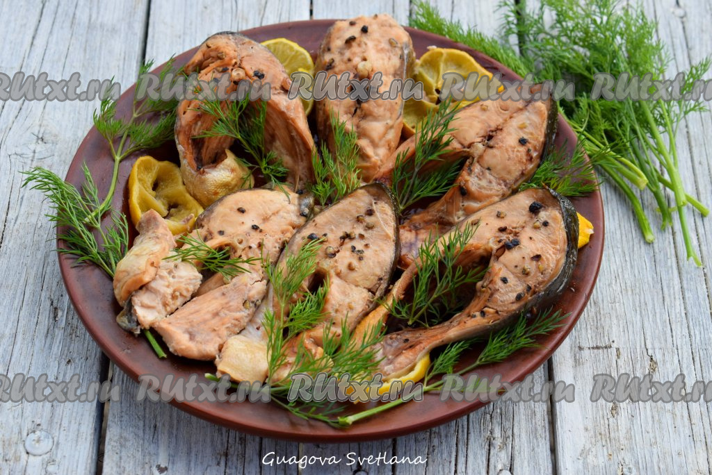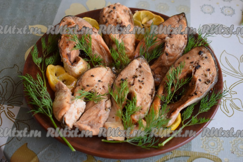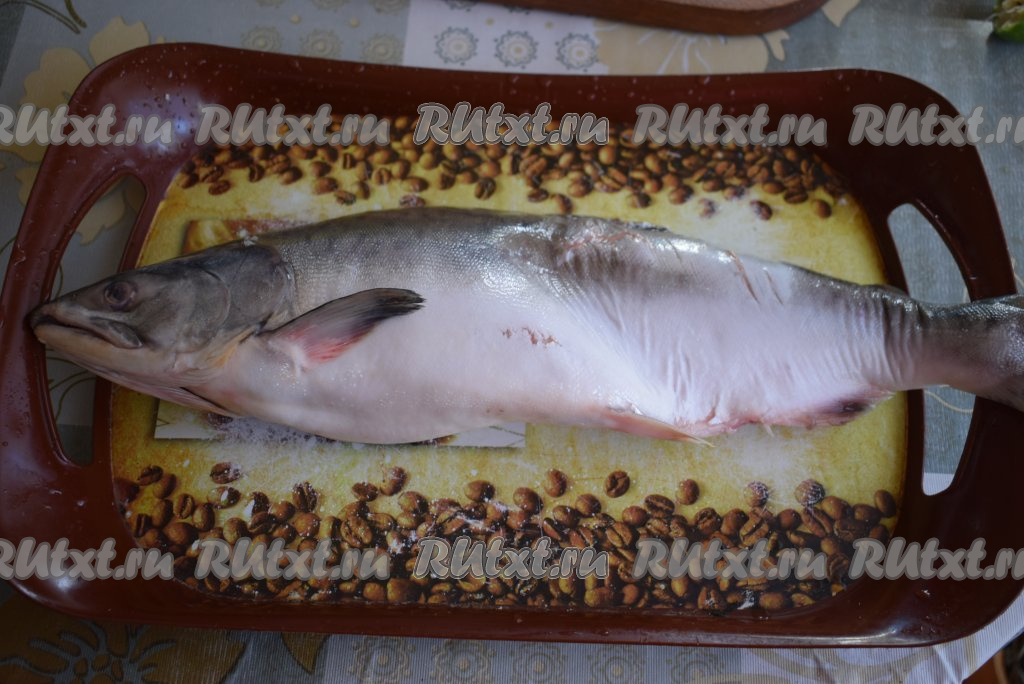 Готовую горбушу достаём из духовки и перекладываем при помощи лопаточки на блюдо.