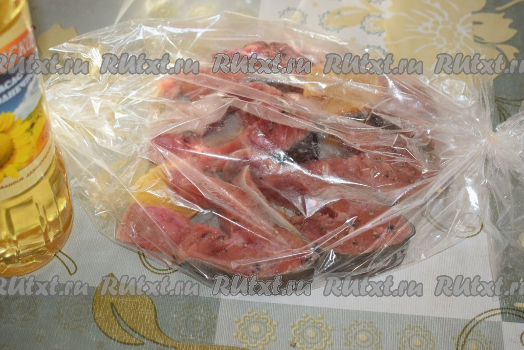 Рукав для запекания с кусочками горбуши кладём на противень. В рукаве с верхней стороны делаем несколько проколов ножом для выхода пара.