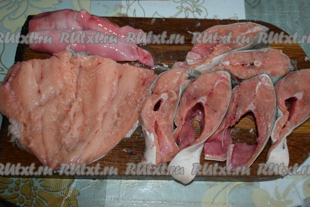 Горбушу нарезаем на порционные кусочки. Так как рыба у меня достаточно большая, я разрезала её на 6 порционных кусочков для запекания в рукаве, а хвостовую часть и молоку решила посолить. Вы же можете запечь всю рыбу или часть заморозить для дальнейшего использования.