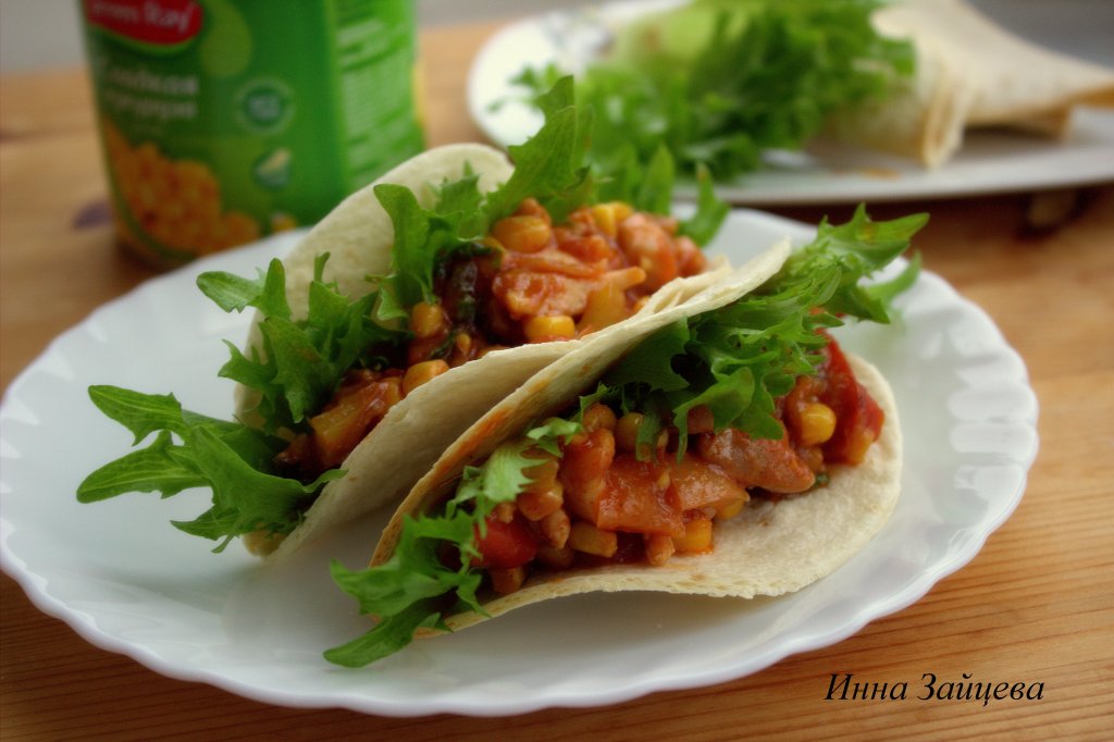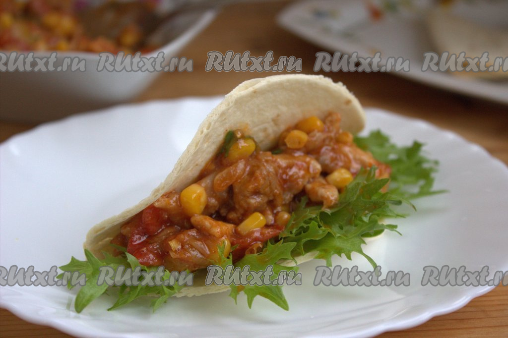 Сегодня хочу предложить рецепт приготовления мексиканского блюда - тако (такос) с курицей. Традиционно тако состоит из кукурузной или пшеничной тортильи (лепёшки), овощей и мяса. Чаще всего лепёшки готовят самостоятельно, но я решила купить в магазине уже готовые пшеничные лепёшки (в одной упаковке 6 штук). Начинку и остроту блюда можно подобрать по своему вкусу. Я добавила в начинку мелко нарезанный острый перец и у меня блюдо получилось острым. Тако с сочной начинкой и хрустящей лепёшкой станет отличным перекусом, попробуйте!