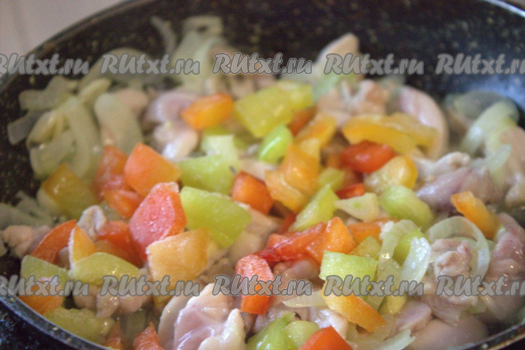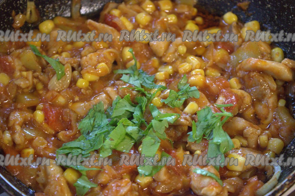 Приправить по вкусу (я приправила молотой паприкой и сухим чесноком). Добавить мелко нарезанный острый перец, именно он и сделает тако по-мексикански острым. Хорошо перемешать содержимое сковороды. При необходимости, влить примерно, 50 миллилитров воды (я не добавляла воду, у меня были очень сочные помидоры). Если добавляли воду, доведите содержимое сковороды до кипения и сразу уменьшите огонь до минимума. Тушить куриное мясо с овощами минут 7-10, не забывая помешивать, если нужно, досолить.