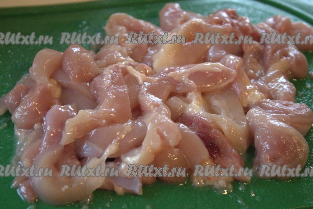 Куриное мясо хорошо промыть под проточной водой, нарезать на тонкие полоски (я использовала филе с куриных бёдер).