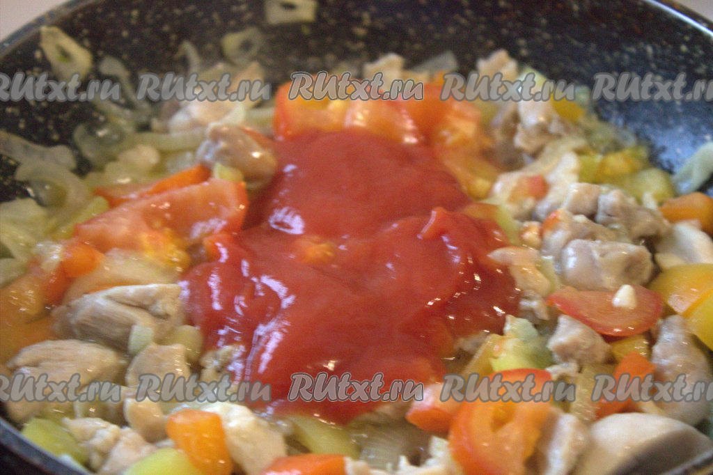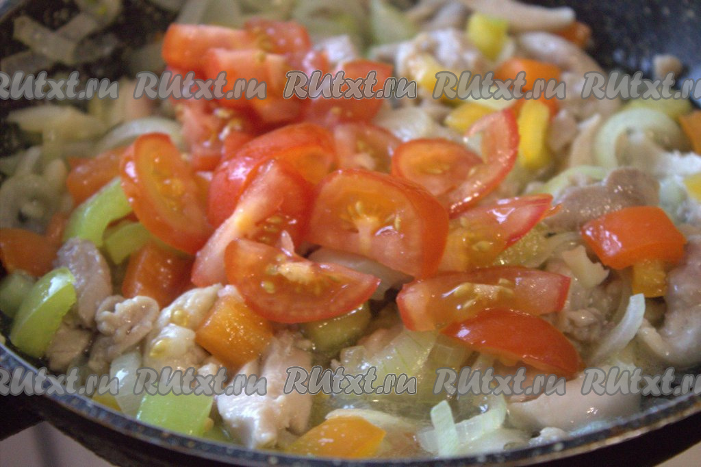 Затем в сковороду к овощам и куриному мясу добавить нарезанные на кусочки помидоры, перемешать.