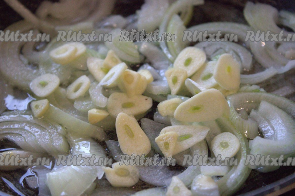 Чеснок очистить и нарезать на тонкие дольки. Добавить в сковороду к луку дольки чеснока, обжарить, тщательно помешивая, примерно, 1 минуту.