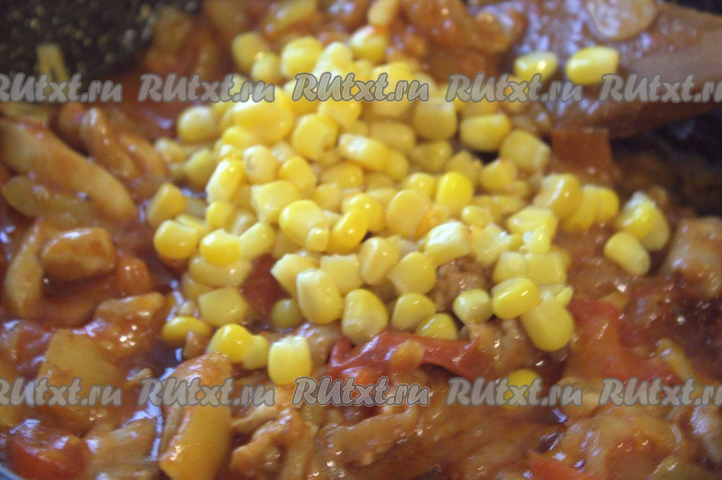 Затем в сковороду к готовым овощам и мясу добавить консервированную кукурузу, перемешать и прогреть 2-3 минуты.